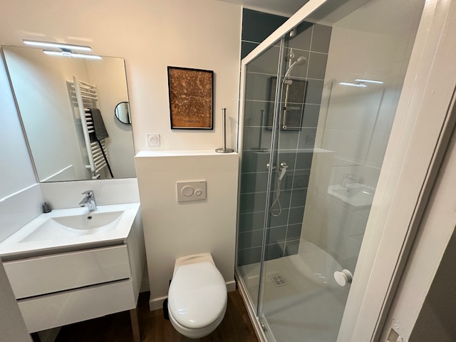 Brest: Au pied de la facs, très beau studio, tout neuf, situé au rez de chaussé d'un petit immeuble, comprenant une pièce de vie avec cuisine aménagée et totalement équipée ( four, frigo, congélateur, plaque de cuisson vitrocéramique, hotte), une salle d'eau avec WC.