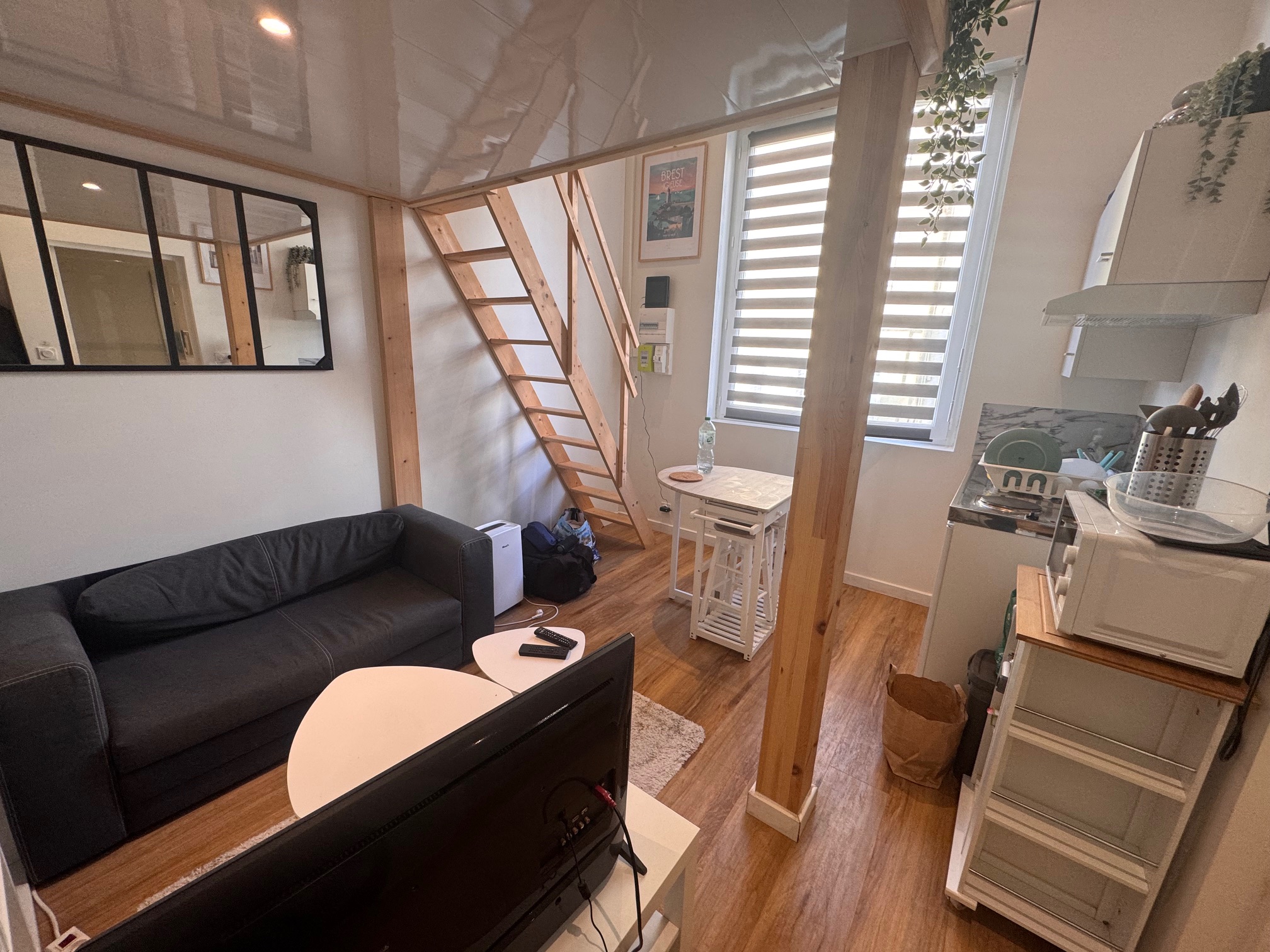 Ce petit appartement plein de cachet se compose d’un espace de vie agréable avec coin salon et cuisine, d’une spacieuse salle d’eau avec douche et WC, ainsi que d’une mezzanine intégrant le coin nuit.