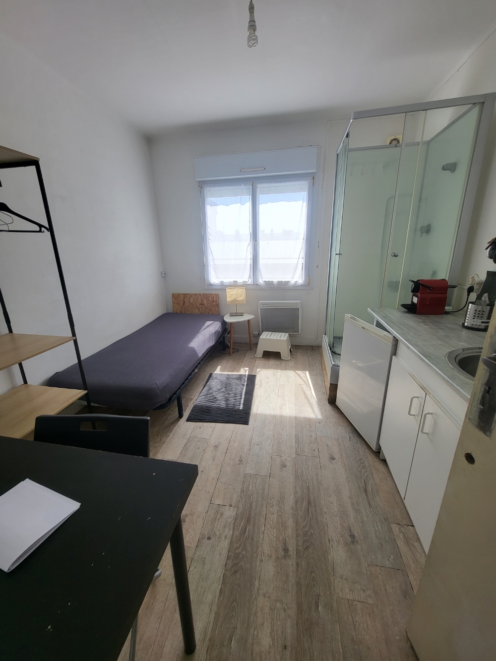 Le logement, vendu meublé, se compose d'une pièce à vivre avec cuisine aménagée et équipée, d'une douche avec vasque et WC. Son atout, une très belle exposition sud-ouest et son accès au balcon-terrasse.